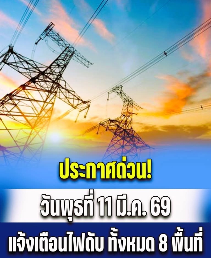 ประกาศด่วน วันพุธที่ 11 มี.ค. 69 แจ้งเตือนไฟดับ ทั้งหมด 8 พื้นที่