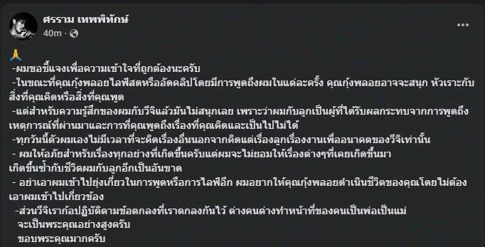 – อย่าเอาผมเข้าไปยุ่งเกี่ยวในการพูดหรือการไลฟ์อีก ผมอยากให้คุณกุ้งพลอยดำเนินชีวิตของคุณโดยไม่ต้องเอาผมเข้าไปเกี่ยวข้อง