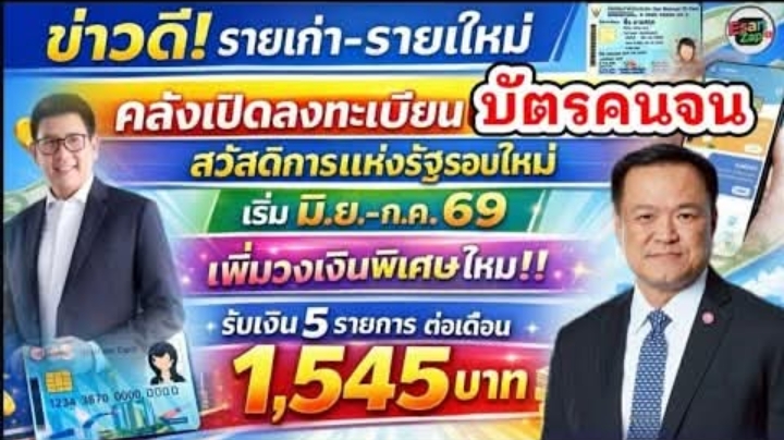 เพิ่มเงินลงทะเบียนบัตรคนจนรอบใหม่ รายเก่า-รายใหม่ เพิ่มเงินพื้นรับ 1,545 ต่อเดือนเริ่ม มิ.ย.-ก.ค.69